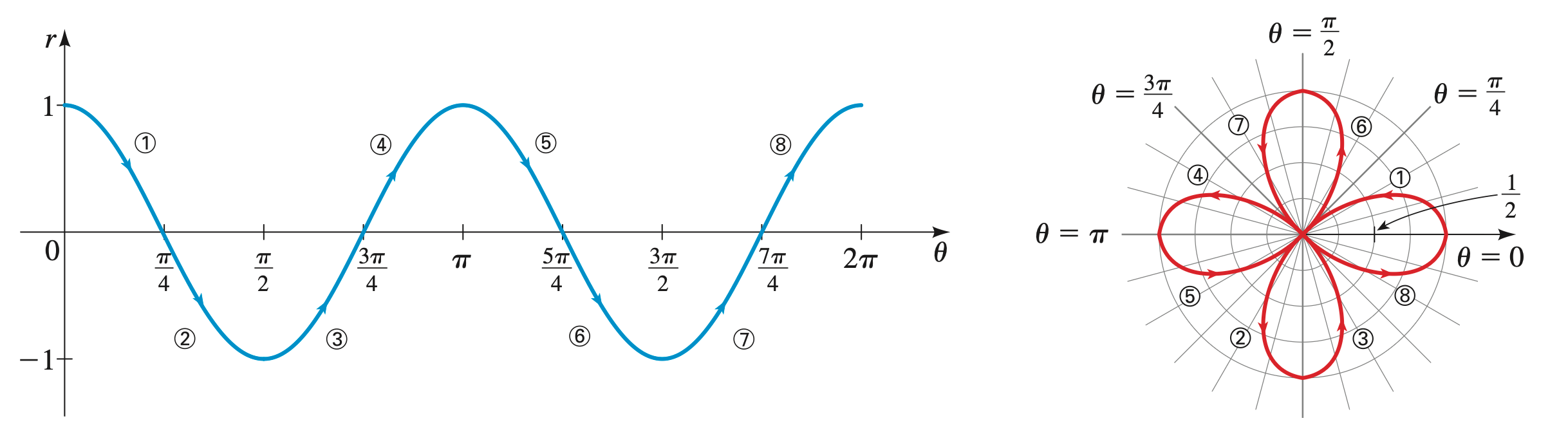 In rectangular coordinates the zeros of the function correspond to the intercepts of the graph. In polar coordinates, the zeros of the function are the angles at which the curve crosses the pole. This is demonstrated in the following example of graphing :