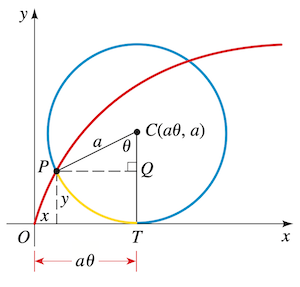 We cover another example. As a circle of radius rolls along the axis, the curve traced out by a fixed point on the circumference is a cycloid for which we try to find the parametric equations. Let be the angle the circle has rolled through with the point started from the origin.