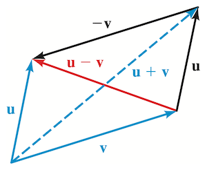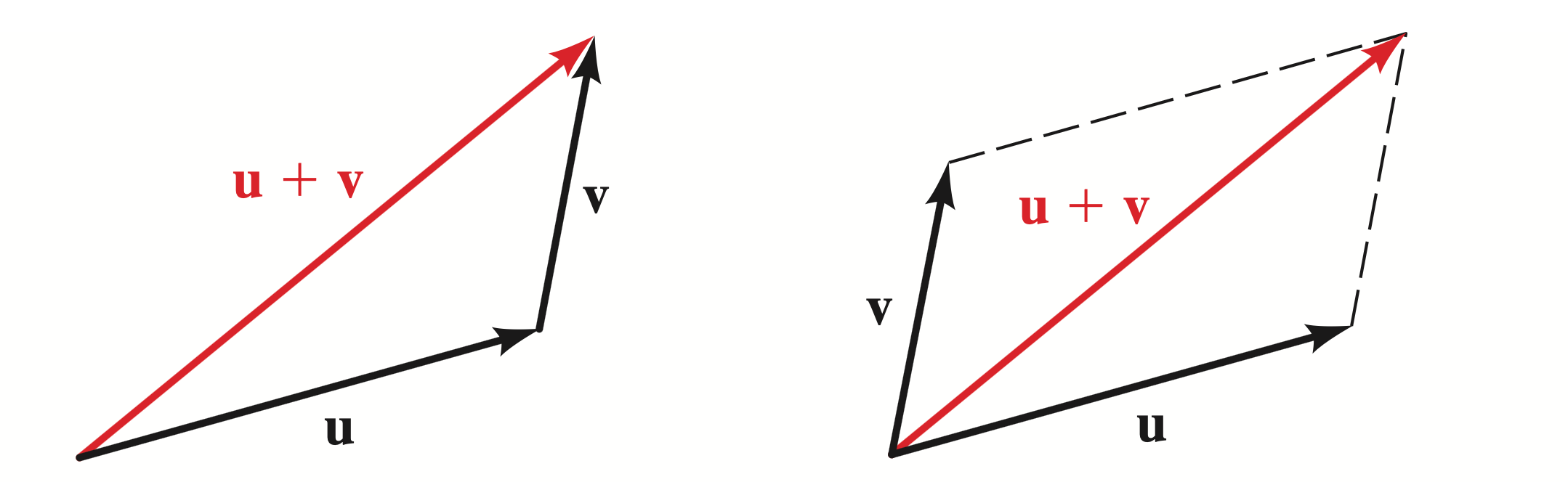 To find the sum of any two vectors and , we sketch vectors equal to and with the initial point of one at the terminal point of the other, or if drawn starting at the same point, and would be the vector that is the diagonal of the parallelogram formed.