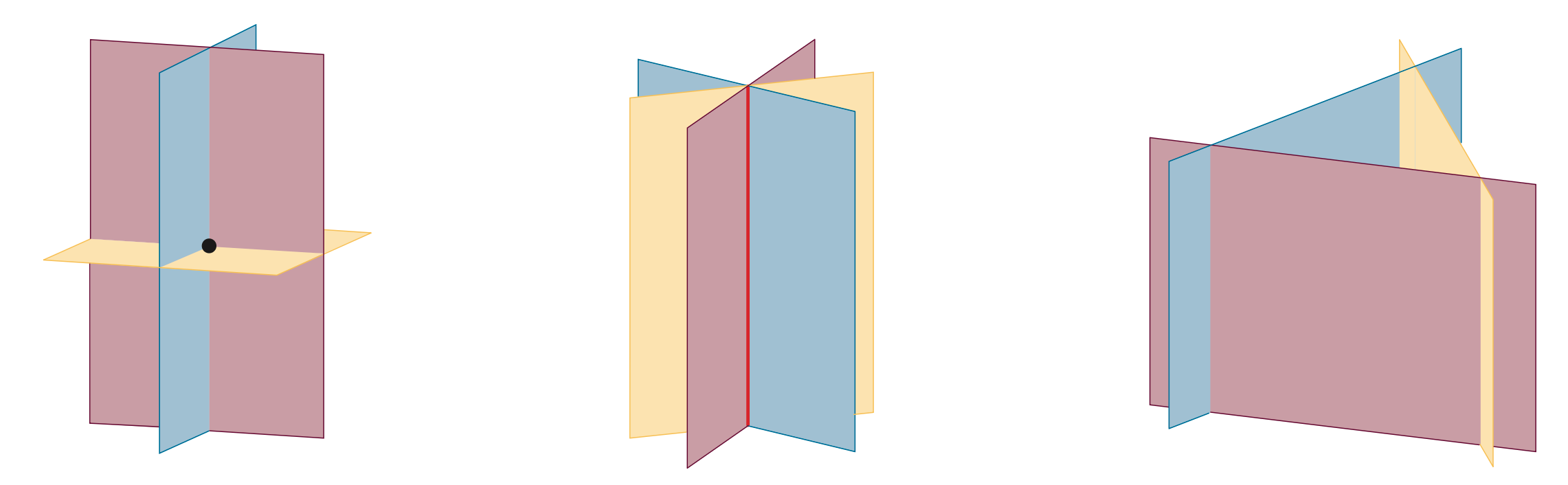 The graph of a linear equation in three variables is a plane in three-dimensional space, so a system of three such equations represents three planes in space, and the solutions are the points where all three planes intersect. The three planes may intersect at a single point, intersect along a line or have no point in common at all. As a result, a system can have exactly one solution, no solution or infinitely many solutions.